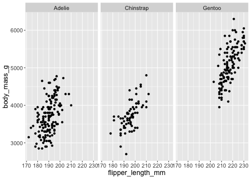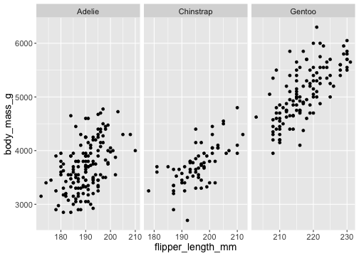 facet_wrap()ggplot(penguins) + geom_point(aes( x = flipper_length_mm, y = body_mass_g)) + facet_wrap(vars(species))