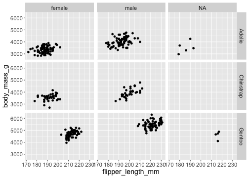 facet_grid()ggplot(penguins) + geom_point(aes( x = flipper_length_mm, y = body_mass_g)) + facet_grid( vars(species), vars(sex))