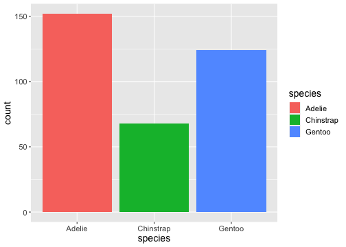 ggplot(penguins) + geom_bar(aes(x= species, fill = species))