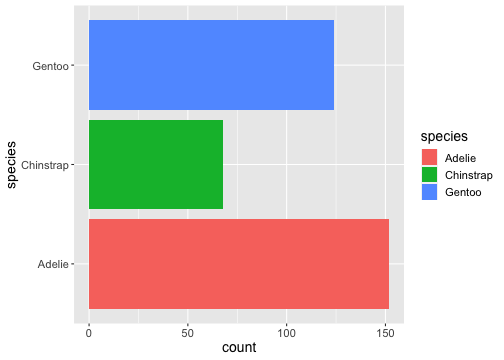 ggplot(penguins) + geom_bar(aes(x= species, fill = species)) + coord_flip()