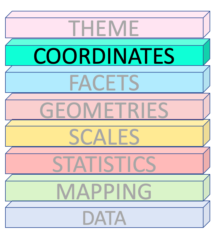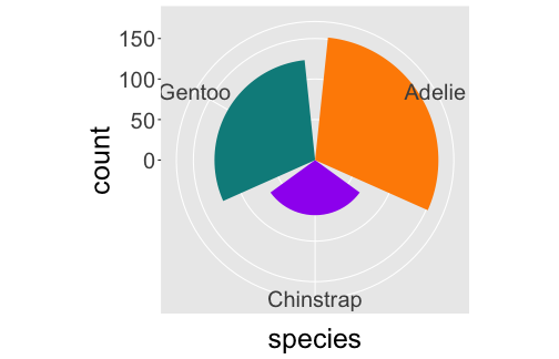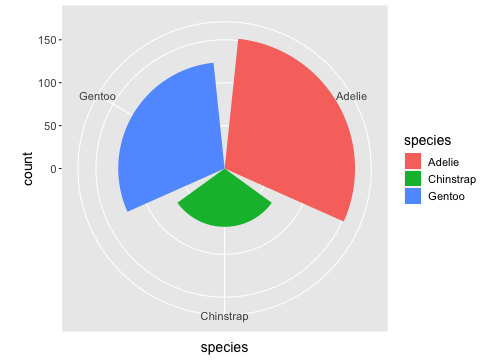 coord_cartesian(), coord_flip(), coord_fixed()coord_map(), coord_quickmap(), coord_sf(), coord_polar(), coord_trans()ggplot(penguins) + geom_bar(aes(x= species, fill = species)) + coord_polar()