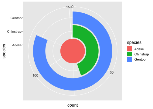 ggplot(penguins) + geom_bar(aes(x= species, fill = species)) + coord_polar(theta = "y")