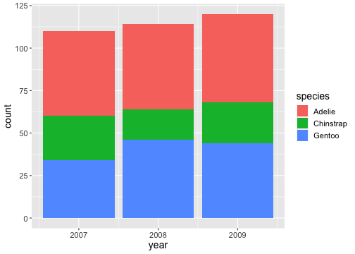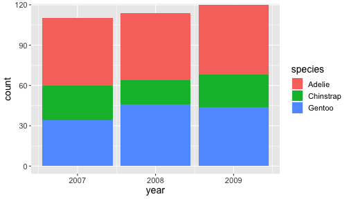 coord_cartesian()ggplot(penguins) + geom_bar(aes(x= year, fill = species)) + coord_cartesian(ylim = c(0,115))