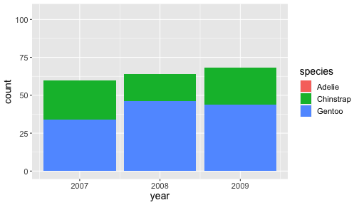 scaleggplot(penguins) + geom_bar(aes(x= year, fill = species)) + scale_y_continuous(limits = c(0,115))
