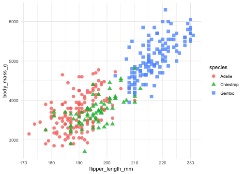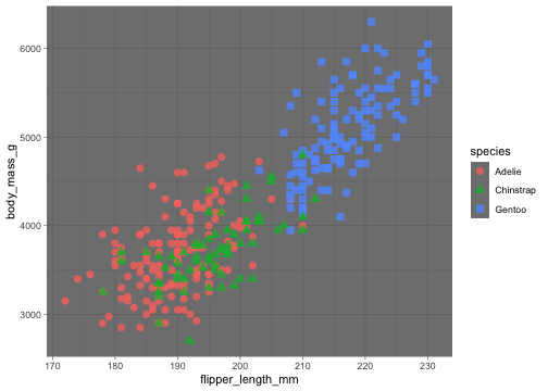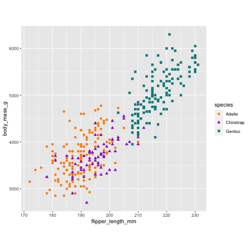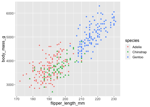 ggplot(penguins) + geom_point( aes(x = flipper_length_mm, y = body_mass_g, color = species, shape = species))