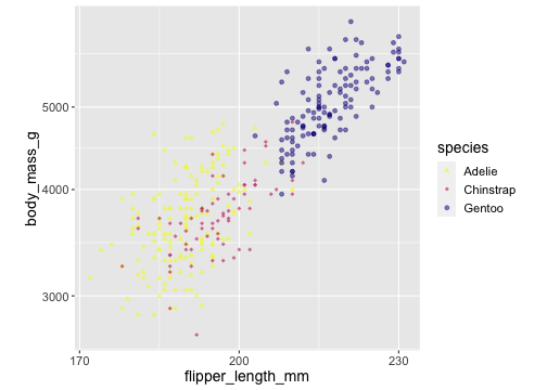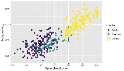 viridis and RColorBrewer provide different color scales that are robust to color-blindness.ggplot(penguins) + geom_point(aes(x = flipper_length_mm, y = body_mass_g, color = species, shape = species, alpha = species)) + scale_x_continuous( breaks = c(170,200,230)) + scale_y_log10() + scale_colour_viridis_d(direction = -1, option= 'plasma') + scale_shape_manual( values = c(17,18,19)) + scale_alpha_manual( values = c( "Adelie" = 0.6, "Gentoo" = 0.5, # "Chinstrap" = 0.7))