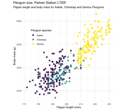 ggplot(penguins, aes(x = flipper_length_mm, y = body_mass_g)) + geom_point(aes(color = species, shape = species), size = 3, alpha = 0.8) + scale_color_viridis_d() + theme_minimal() + labs( title = "Penguin size, Palmer Station LTER", subtitle = "Flipper length and body mass for Adelie, Chinstrap and Gentoo Penguins", x = "Flipper length (mm)", y = "Body mass (g)", color = "Penguin species", shape = "Penguin species") + theme( aspect.ratio = 1, legend.position = c(0.2, 0.7), legend.background = element_rect( fill = "white", color = NA), plot.title.position = "plot", plot.caption = element_text( hjust = 0, face= "italic"), plot.caption.position = "plot")