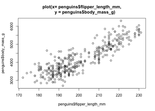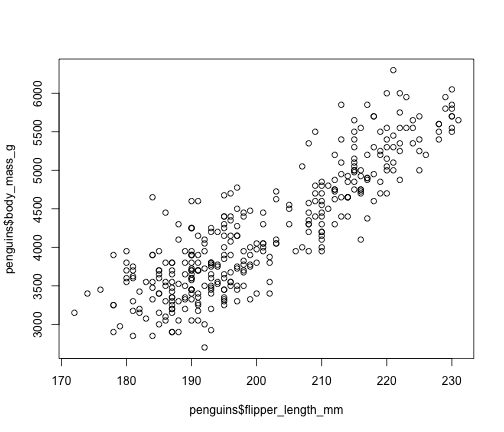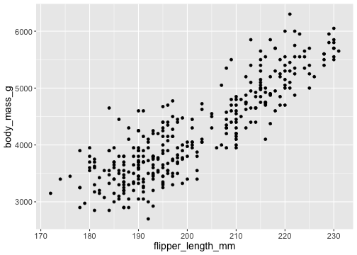 ggplot(data = penguins, mapping = aes(x = flipper_length_mm, y = body_mass_g)) + geom_point()