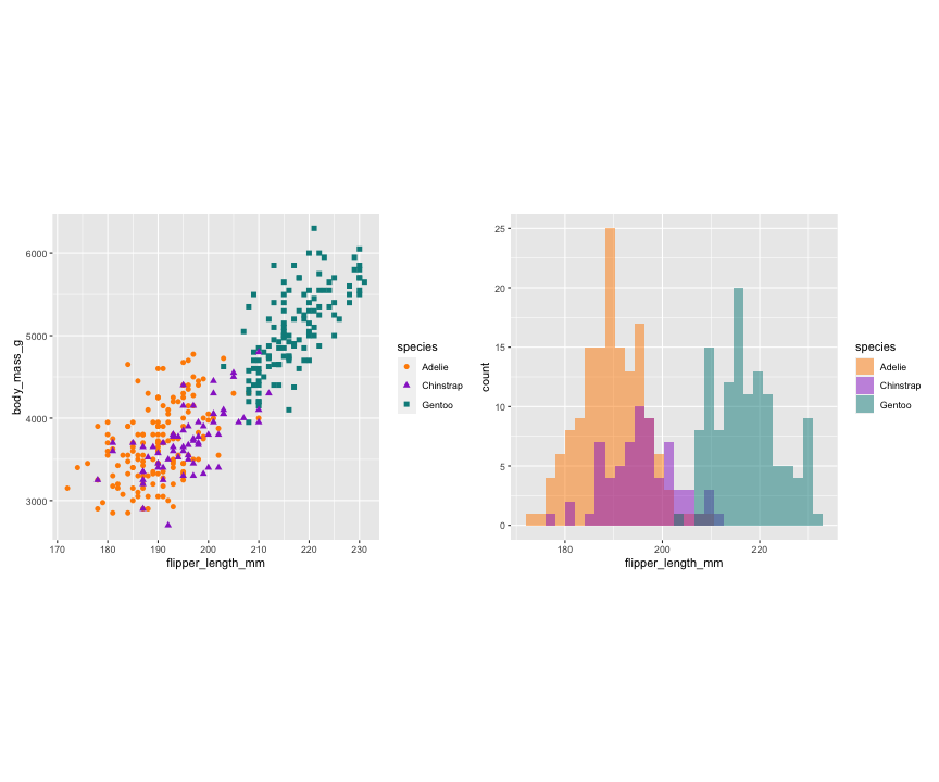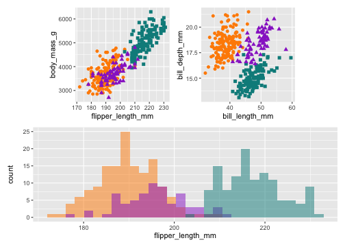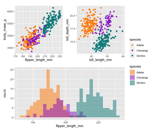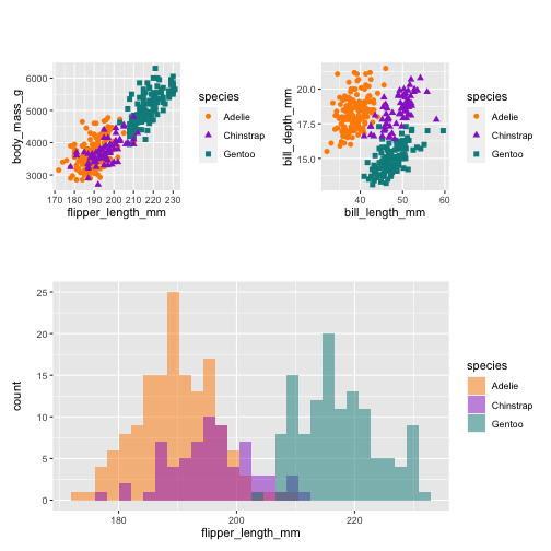 p1 <- ggplot(data = penguins, aes(x = flipper_length_mm, y = body_mass_g)) + geom_point(aes(color = species, shape = species), size = 2) + scale_color_manual(values = c("darkorange","darkorchid","cyan4")) + theme(aspect.ratio = 1)p2 <- ggplot(data = penguins, aes(x = bill_length_mm, y = bill_depth_mm)) + geom_point(aes(color = species, shape = species), size = 2) + scale_color_manual(values = c("darkorange","darkorchid","cyan4")) + theme(aspect.ratio = 1)p3 <- ggplot(data = penguins, aes(x = flipper_length_mm)) + geom_histogram(aes(fill = species), alpha = 0.5, position = "identity") + scale_fill_manual(values = c("darkorange","darkorchid","cyan4"))library(patchwork)p1 + p3