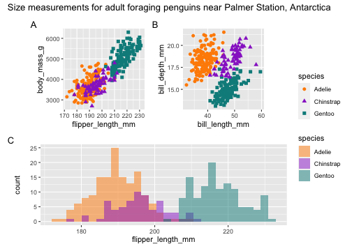 library(patchwork)p <- (p1 | p2) / p3p + plot_layout(guide = 'collect') + plot_annotation( title = 'Size measurements for adult foraging penguins near Palmer Station, Antarctica', tag_levels = 'A')