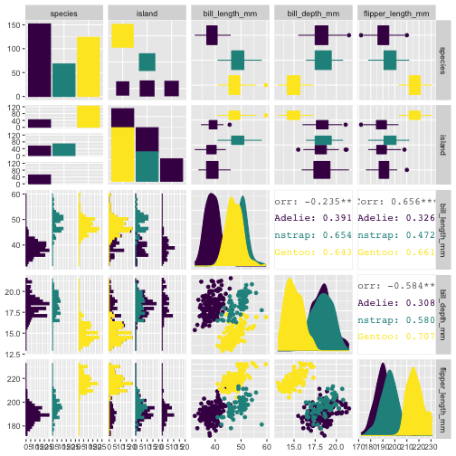 GGallyGGally::ggpairs(penguins[, 1:5], aes(color = species, fill = species))+ scale_color_viridis_d() + scale_fill_viridis_d()