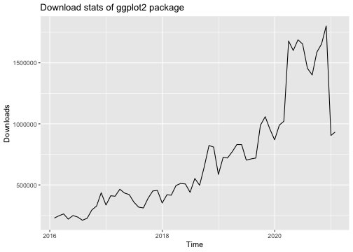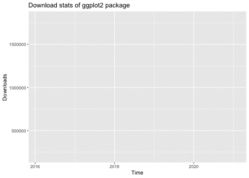 library("ggplot2")library("dlstats")data <- cran_stats("ggplot2")p <- ggplot(data, aes(x= end, y = downloads)) + geom_line() + labs(title = "Download stats of ggplot2 package", x = "Time", y = "Downloads")p