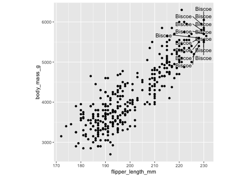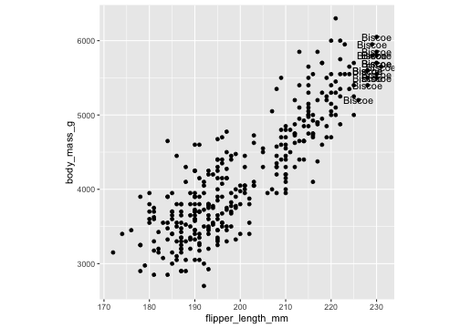 df <- penguins %>% filter( flipper_length_mm > 225 )ggplot(penguins, aes(x=flipper_length_mm, y= body_mass_g))+ geom_point()+ theme(aspect.ratio = 1) + geom_text(data= df, aes(x=flipper_length_mm, y= body_mass_g, label= island))