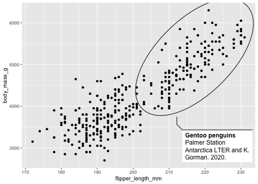 library(ggforce)penguins <- penguins %>% drop_na()p <- ggplot(penguins, aes(x=flipper_length_mm, y= body_mass_g))+ geom_mark_ellipse(aes( filter = species == "Gentoo", label = 'Gentoo penguins'), description = 'Palmer Station Antarctica LTER and K. Gorman. 2020.') + geom_point() p