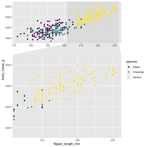 library(ggforce)ggplot(penguins, aes(x=flipper_length_mm, y= body_mass_g, color = species)) + geom_point() + scale_color_viridis_d() + facet_zoom(x = species == "Gentoo")