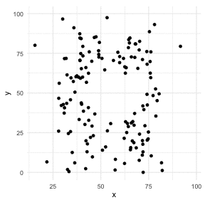 library(datasauRus)library(ggplot2)library(gganimate)ggplot(datasaurus_dozen, aes(x=x, y=y))+ geom_point()+ theme_minimal() + transition_states(dataset, 3, 1) + theme(aspect.ratio = 1)