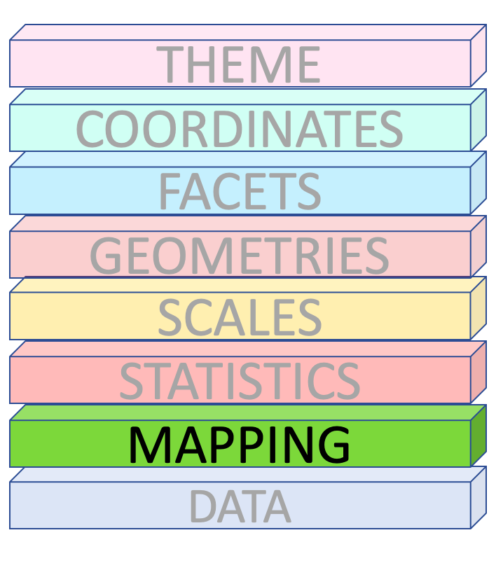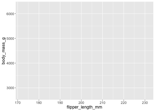 # A tibble: 6 x 8 species island bill_length_mm bill_depth_mm flipper_length_… body_mass_g sex <fct> <fct> <dbl> <dbl> <int> <int> <fct>1 Adelie Torge… 39.1 18.7 181 3750 male 2 Adelie Torge… 39.5 17.4 186 3800 fema…3 Adelie Torge… 40.3 18 195 3250 fema…4 Adelie Torge… NA NA NA NA <NA> 5 Adelie Torge… 36.7 19.3 193 3450 fema…6 Adelie Torge… 39.3 20.6 190 3650 male # … with 1 more variable: year <int>Rows: 344Columns: 8$ species <fct> Adelie, Adelie, Adelie, Adelie, Adelie, Adelie, Ade…$ island <fct> Torgersen, Torgersen, Torgersen, Torgersen, Torgers…$ bill_length_mm <dbl> 39.1, 39.5, 40.3, NA, 36.7, 39.3, 38.9, 39.2, 34.1,…$ bill_depth_mm <dbl> 18.7, 17.4, 18.0, NA, 19.3, 20.6, 17.8, 19.6, 18.1,…$ flipper_length_mm <int> 181, 186, 195, NA, 193, 190, 181, 195, 193, 190, 18…$ body_mass_g <int> 3750, 3800, 3250, NA, 3450, 3650, 3625, 4675, 3475,…$ sex <fct> male, female, female, NA, female, male, female, mal…$ year <int> 2007, 2007, 2007, 2007, 2007, 2007, 2007, 2007, 200…ggplot()