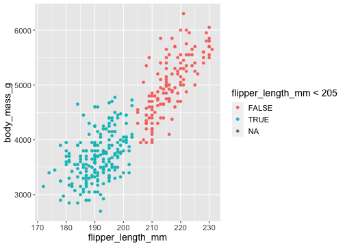 ggplot(penguins) + geom_point( aes(x = flipper_length_mm, y = body_mass_g, colour = flipper_length_mm < 205))