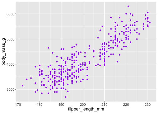 ggplot(penguins) + geom_point( aes(x = flipper_length_mm, y = body_mass_g), colour = 'purple')