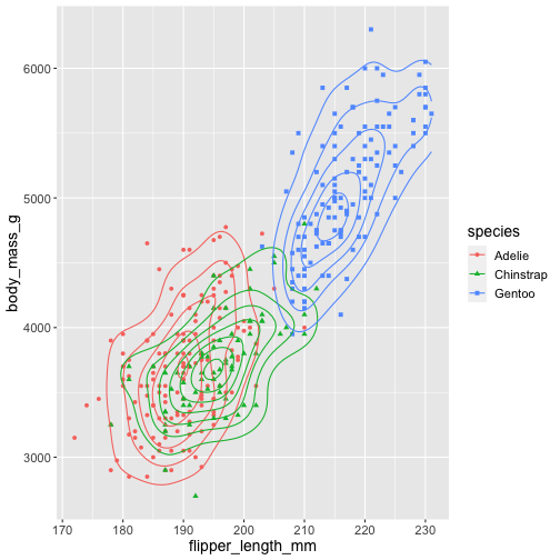 ggplot(penguins, aes(x = flipper_length_mm, y = body_mass_g, color = species, shape = species)) + geom_point() + geom_density_2d()