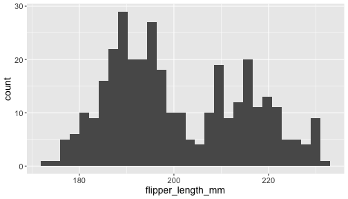 ggplot(penguins) + geom_histogram( aes(x = flipper_length_mm))