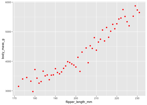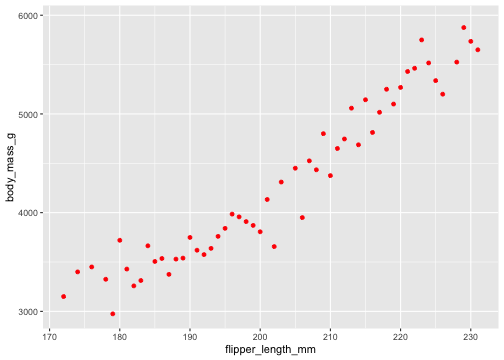 ggplot(penguins, aes(x = flipper_length_mm, y = body_mass_g)) + stat_summary( geom ="point", fun.y ="mean", colour ="red")