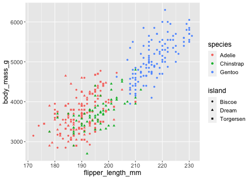 ggplot(penguins) + geom_point( aes(x = flipper_length_mm, y = body_mass_g, color = species, shape = island))
