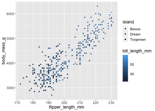 ggplot(penguins) + geom_point( aes(x = flipper_length_mm, y = body_mass_g, color = bill_length_mm, shape = island))
