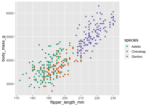 ggplot(penguins) + geom_point(aes(x = flipper_length_mm, y = body_mass_g, color = species)) + scale_color_brewer(type = 'qual', palette = 'Dark2')
