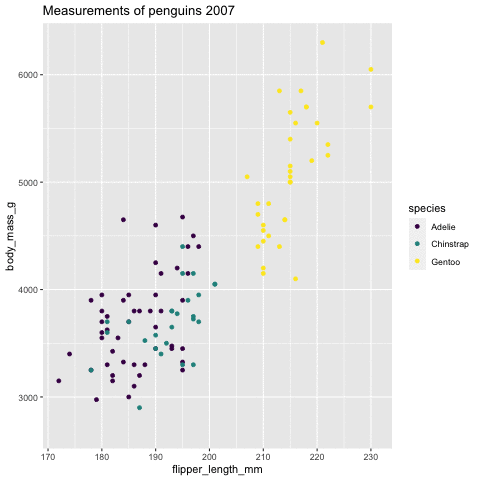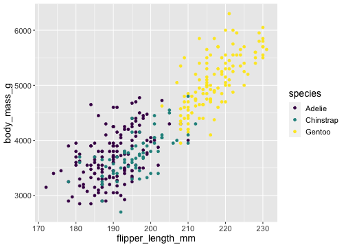 ggplot(penguins) + geom_point(aes(x = flipper_length_mm, y = body_mass_g, color = species)) + scale_color_viridis_d()